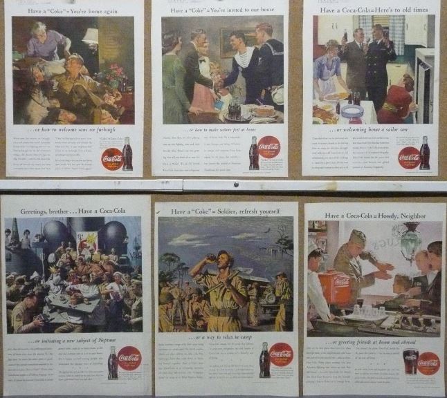 Plucked from the pages of magazines such as “Life,” these colorful, patriotic adverts look fantastic dislayed with other Coca-Cola memoriabilia or militaria (source: eBay image).