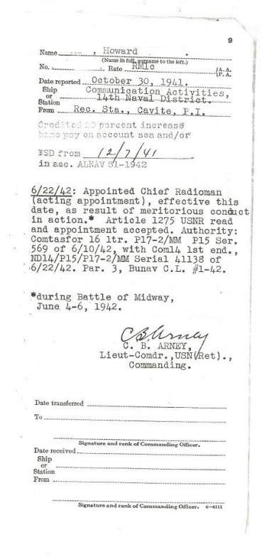 This service record entry shows that my uncle was meritoriously promoted for his actions during the Midway battle.
