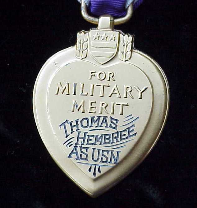 Apprentice Seaman Thomas Hembree was awarded his Purple Heart Medal posthumously having lost his life aboard the USS Arizona during the Japanese attack (image source: US Militaria Forum).