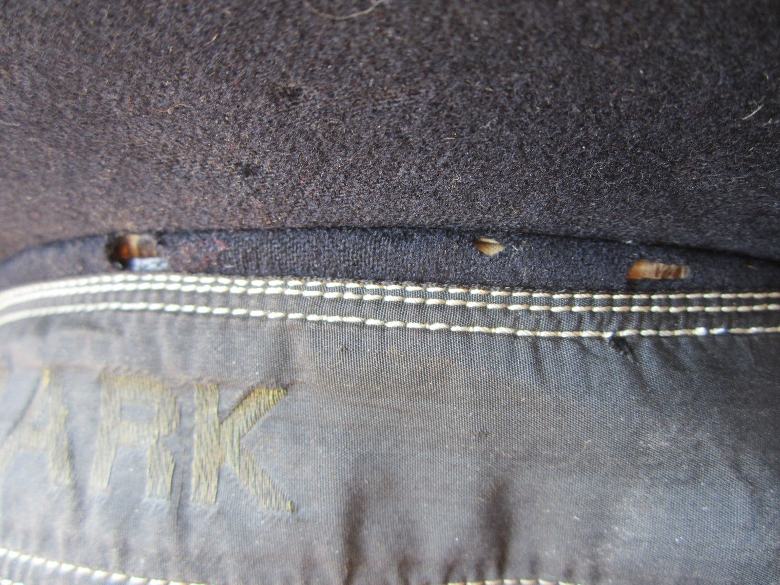 A close-up of the USS Newark (C-1) tally and the stitching that attaches it to the hat. Moths have nipped away where the top is mated to the head band. Note the gold stitching of the ship name (Source: eBay image).