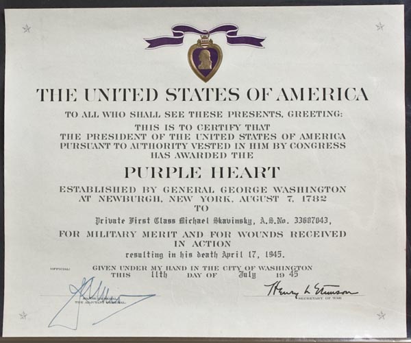 PFC Skavinsky’s accompanying certificate documenting the awarding of the medal and the date in which he was wounded. (Source: PurpleHearts.net