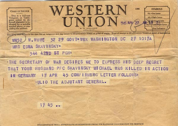 This is the Western Union telegram that was delivered to PFC Skavinsky’s wife, notifying her of his death. It took 10 days to get word to her. (Source: PurpleHearts.net)