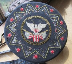 Aside from the black (flat straw) hats, sailors also began wearing blue cloth cap that was the forerunner of what was later known as the dress blue hat for enlisted personnel. By the time the American Civil War began, the blue cloth caps were the most commonly worn hats by petty officers and seaman. The long ribbons that encircled the black hats were transitioned to shortened (without the extended streaming tails) versions and some were adorned with the name of the sailor’s ship name (sans “U.S.S.”) added by hand using gold paint. Late in the Civil War, there were some instances of entire crews having their talley’s embroidered (with gold bullion) in lieu of the painted vessel names. The gold wire-bullion embroidery became common (though still not standardized) with for flat hats in the 1883 naval uniform regulations. Another aspect of the blue caps was that they were soft and formless leaving sailors to customize their caps to suit their individual style by adding stiffeners or filling (almost pillow-like) to give them a personalized shape. In 1866, the black hat tarpaulin hats were no longer used.